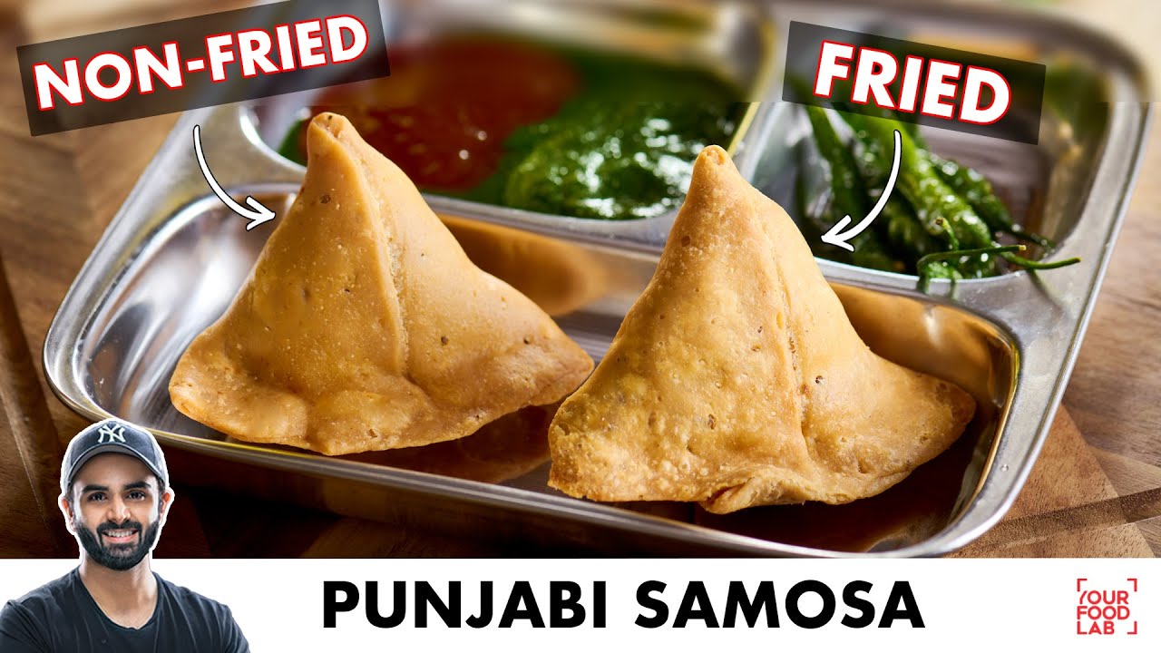 For dough, add flour, semolina, salt, carom seeds and ghee, in a mixing bowl, mix well until combined well, make sure to crush the carom seeds between your palms to enhance the flavour, the texture should be somewhere similar to breadcrumbs & should stick when pressed.Add cold water gradually in the flour and knead a stiff & tight dough, knead the dough well for 7-8 minutes, after kneading cover the dough with a damp cloth and rest for 30 minutes. By the time you can prepare the filling.For filling, we need to make the ginger & green chilli paste, for that, add green chillies & ginger in grinding jar and grind into a fine paste, keep the paste aside to be used later in making the filling.Further, take a mortar & pestle, add cumin, fennel seeds, and coriander seeds and grind to a coarse powder, you can also grind the spices in a mixer grinder, keep the powder aside to be used later in making the filling.Cut the boiled potatoes in quarters and further slice them, keep aside for making filling.Set a pan or a wok on low heat, add ghee, further add the grounded spices & briefly cook on low heat for 30-40 seconds, now add the ginger chilli paste, stir & cook for 1-2 minutes on low flame, further add the boiled potatoes, green peas, salt & pepper to taste, chaat masala, kasuri methi and freshly chopped coriander leaves, stir well to mix the potatoes and the masala well.Increase the flame to medium high & cook the potatoes for 6-7 minutes, it should get some colour while cooking, mash the potatoes lightly while keeping few chunks intact. Further transfer the mixture in a bowl and allow it to cool down to room temperature. As the filling is ready, you can make the samosa.For making samosa, make the samosa sheets, for that, knead the dough once again that has been resting & divide in equal size dough balls, further flatten the dough balls in thin sheets, making an oval shape, make sure the sheet is not too thin or too thick, divide the sheet width wise in two equal halves. Roll the sheet once again after cutting, as the sheet may shrink a little bit.Pick one sheet & apply water on the edge of the straight line, bring the ends together and seal well to shape like a cone, fill sufficient amount of aloo filling, while lightly pressing downwards, bring the openings of the samosa together and seal properly to shape a proper samosa. Shape all the samosa in same way, make sure to cover with a cloth while you’re shaping other samosa. By the time you can set oil for deep frying.For frying, set oil in a big wok for deep frying, make sure the wok should be wide enough, heat the oil on medium heat and drop in the samosa, fry the samosa on medium heat until they are crisp and golden brown in colour, make sure to fry the samosa in batches but in good quantity that the wok is filled but do not overcrowd, make sure the oil should not be too hot, fry the samosa on low to medium flame the samosas are perfectly cooked from inside, adjust the flame accordingly, if you have a thermometer, fry the samosa at 140 ℃ - 150 ℃.To make them in an air fryer, preheat the air fryer for 5-10 minutes over 180 C, then place the shaped samosa in the air fryer & brush them with ghee, air fry them for 20-25 minutes until crisp & golden brown, you can turn the samosas around after a while so that they cook evenly. You could use a convection oven (not a classic oven that does not have an air circulation mechanism) as well for this.Your crispy hot samosas are ready, you can serve as it is with the chutneys of your choice or you could also take to another level by serving it with chole.
