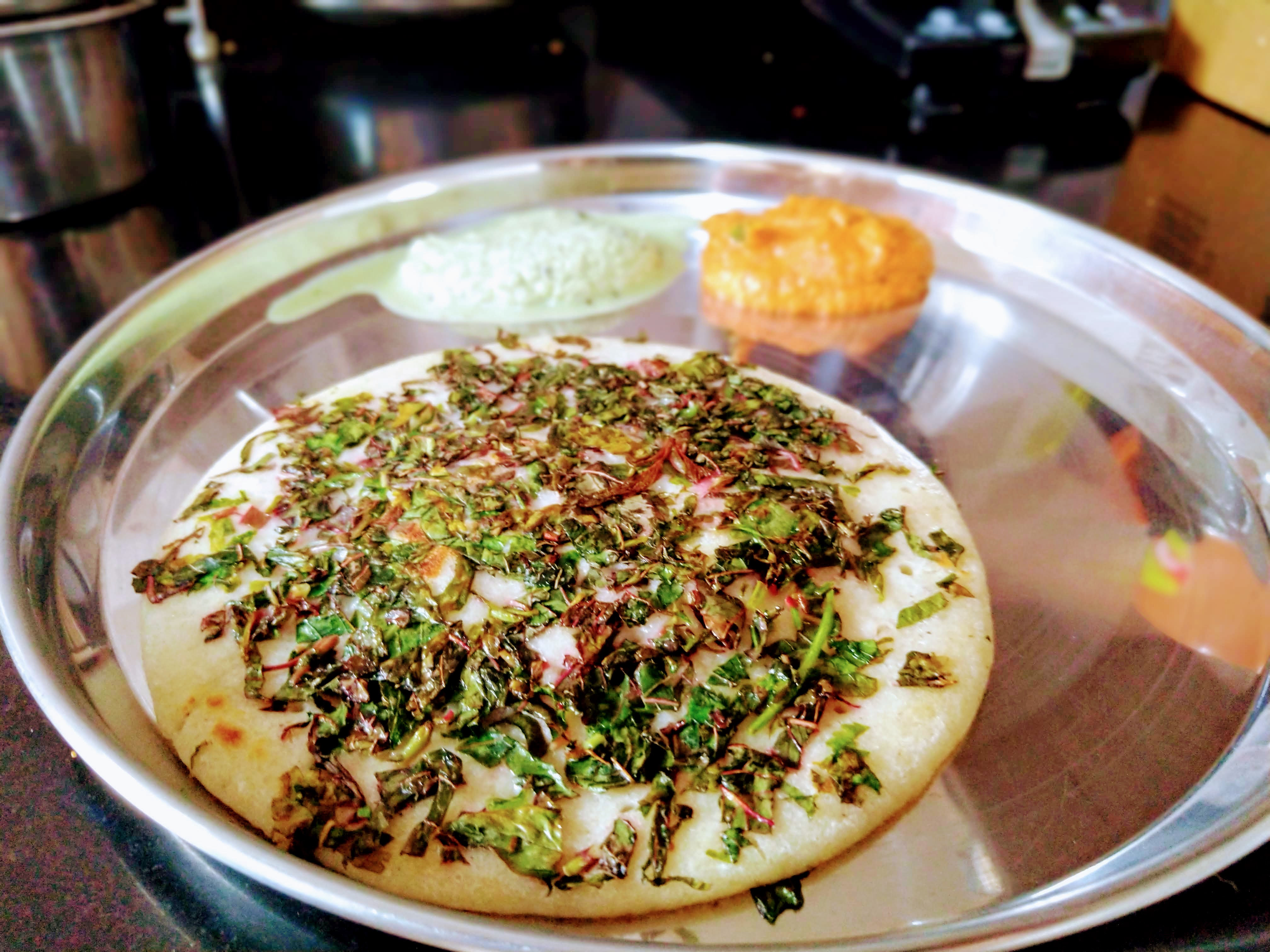 Soak the sorghum millet, rice, urad dal and the fenugreek seeds for about 6 hours (if the room temperature is lower than 20° C, soak for 8 to 12 hours) in about 1.2 litres of water.Once soaked, grind the grains with enough water to submerge the grains—no more, no less—in the grinder jar. Grind to a fine paste. The paste should feel thick-but-slightly-slimy to touch.Add salt per taste.Leave the batter overnight to ferment a little.Chop fresh amaranth to prepare to make the uthappam.Place a cast iron griddle on the stove and coat it with sesame oil.Lower the flame once the griddle is hot.Spread about 150 ml of the batter like a pancake.Top the uthappam with chopped amaranth leaves.Cover the uthappam with a lid to speed up the cooking.Wait about 30 seconds (this will depend on the flame size and heat intensity; check for slight browning of the bottom of the uthappam)Spray oil on the top of the uthappam and flip it.Cover and cook again for about 20 seconds. Ensure not to burn the amaranth or the uthappam.Serve with kaara chutney.