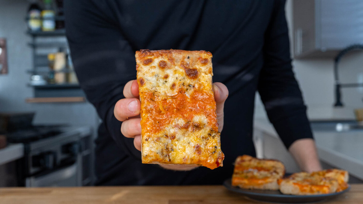 Add the dough ingredients to a bowl except for the olive oil, and mix until a sticky dough forms. Set a bowl over top and let rest for 15 minutes.Add the sauce ingredients to a saucepot and place on low heat with a lid over top. Simmer for 20 to 30 minutes.Back at the dough, stretch and knead for about 5 minutes until it passes the windowpane test. (Tear off a piece and stretch it until very thin and translucent without tearing.) Set the bowl over the top and let rise for 30 minutes.Stir the sauce and remove the lid, let simmer for another 30 minutes.Turn off the sauce and blend with an immersion blender.Add the chopped basil and adjust the seasoning to taste. Store in the fridge until ready to use.Get out a Detroit-style pizza pan (10″×14″) or quarter baking sheet and add the olive oil. Toss the dough in and stretch to the edges until it starts to spring back.Let rest for 20 minutes.Preheat the oven to 450 F (232 C).Top the pizza by laying the chiles and oregano down first and follow with the shredded mozzarella.Spoon over the sauce in 3 strips.Bake for about 20 minutes until the crust is golden brown and crispy and the cheese is bubbly.Slide the cooked pizza onto a cooling rack for 5 minutes before slicing and enjoying.